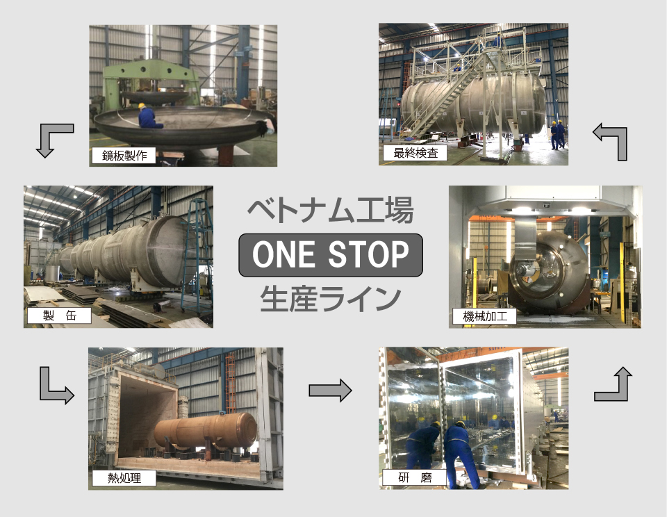 日本鏡板工業は、長年培ってきた鏡板製造技術を生かし、各種圧力容器や食品・医療品関係の機器をONE-STOP生産体制を構築したベトナム現地法人(RK ENGINEERING)にて製造し、日本をはじめ全世界に当社製品を広く販売展開しております。